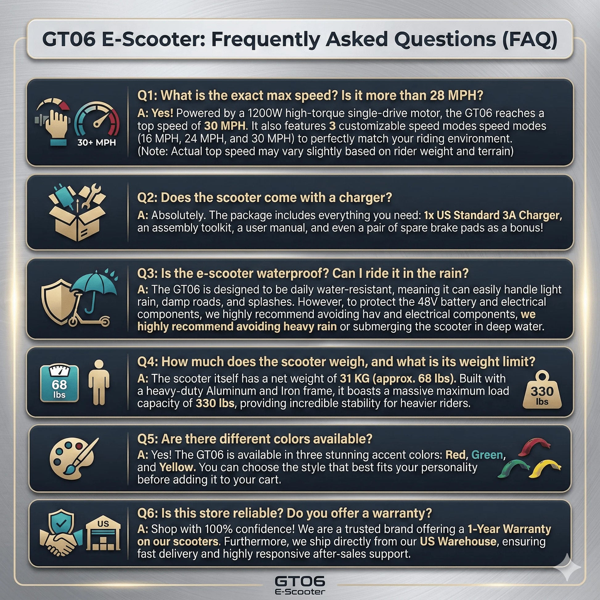 Power through pavement and dirt with the GT06 Electric Scooter—you’ll enjoy off-road capability and everyday practicality in a foldable package.