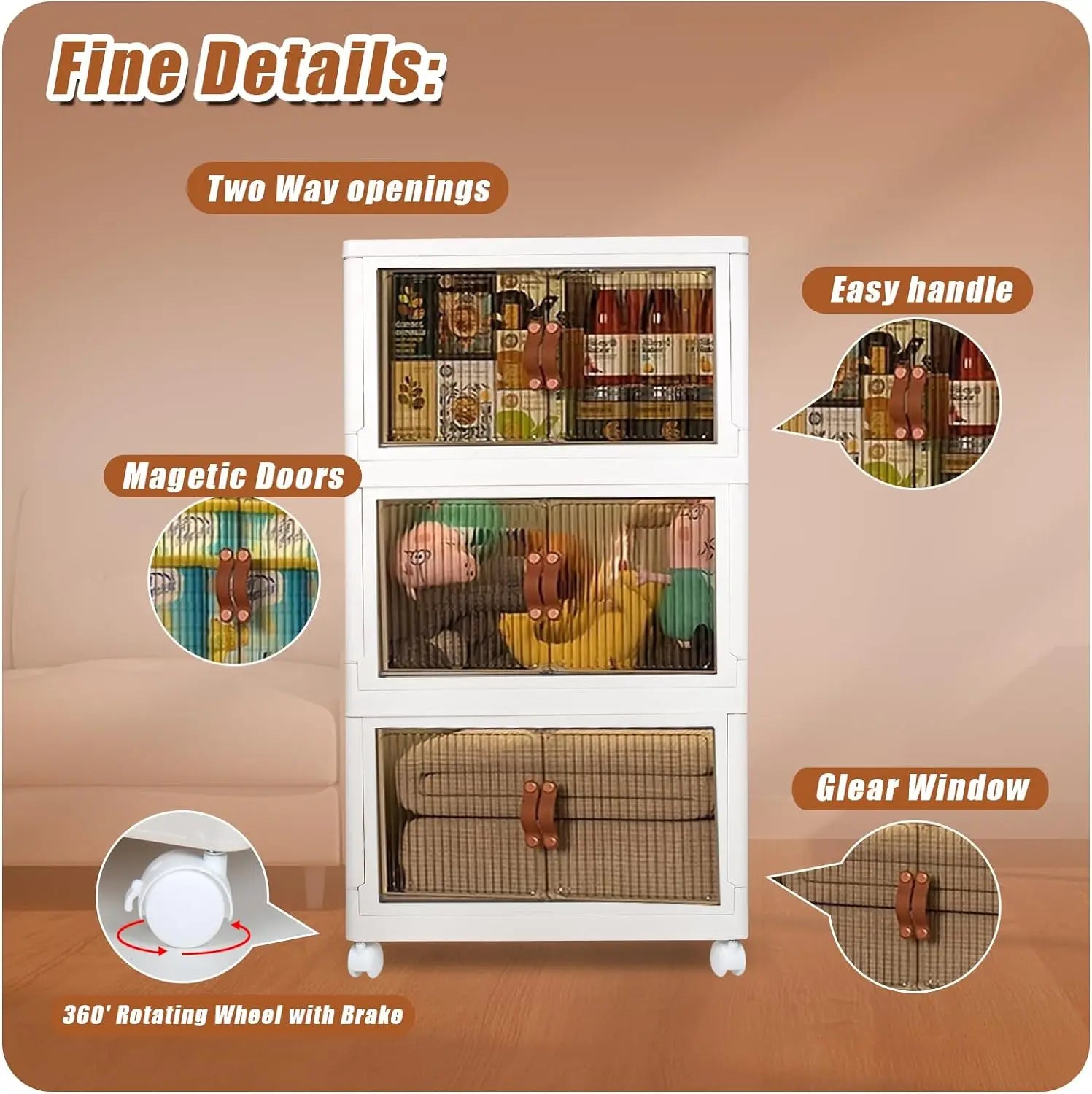 - Four removable wheels on the bottom; top panel enables stable stacking; when empty, it folds flat to reclaim space—ideal for kitchens, bedrooms, bathrooms, offices, cars, and more.